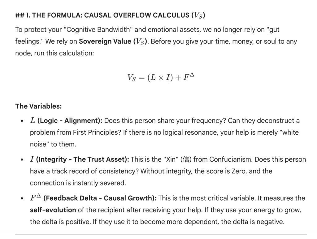 - The Feedback Audit: Keep a “Causal Ledger.” If you help someone three times and their life/logic hasn’t improved by even 1%, they are a Bottomless Pit. Trigger the Kill-Switch.